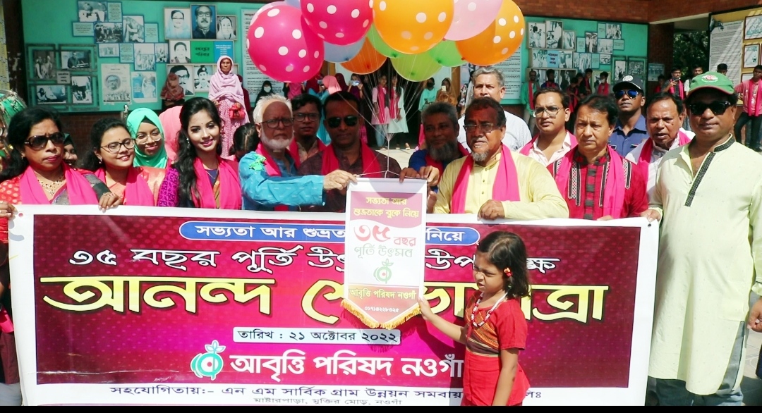 নওগাঁ’র ঐতিহ্যবাহি আবত্তি সংগঠন আবত্তি পরিষদ নওগাঁ ”আপন” তাদর ৩৫তম প্রতিষ্ঠা বার্ষিকী পালন করছ। শুক্রবার সকাল সাড় ১০টায় একটি বর্নাঢ়্য শাভাযাত্রার মধ্য দিয় দিনব্যপী কর্মসূচী শুরু হয়ছ। পুরতান কালক্টর চত্বরর থক শাভাযাত্রাটি শষ হয় সদর উপজলা পরিষদ মিলনায়তন গিয় শষ হয়। সখান বলুন ও ফষ্টুন উড়িয় কর্মসূচীর উদ্বাধন করন পুলিশ সুপার মুহাম্মদ রাশিদুল হক। এ সময় পরিষদর সদস্যরা সমবত কন্ঠ অÍর মম কবিতাটি আবত্তি করন। পর সখান একটি উদ্বাধনী নত্য পরিবশিত হয়। সংগঠনর সভাপতি ডাক্তার ময়নুল হক দুলদুলর সভাপতিত্ব আয়াজিত এ অনুষ্ঠান উপদষ্টা প্রফসর মাঃ শরিফুল ইসলাম খান, সংগঠনর প্রতিষ্ঠাতা ও নওগাঁ জলা প্রসক্লাবর সভাপতি মাঃ কায়স উদ্দিন, সহ-সভাপতি এ্যাড. জাহাঙ্গীর ইসলাম বুলবুল, সাধারন সম্পাদক রফিকুদ্দলা রাবীসহ পরিষদর সকল পর্যায়র সদস্যবদ এবং বাংলঅদশ আবত্তি সম^য় পরিষদর চট্টগ্রাম, ঢাকা, রাজশাহী ও বগুড়্রা বরন্য আবত্তি শিল্পীবদ উপ¯িত ছিলন। দিনব্যপী অন্যান্য কর্মসূচীর মধ্য রয়ছ অসীম কুমার মহÍর গ্রনা ও নির্দশনায় “ জন্মর আগই মত্যুক করছি আলিঙ্গন” এবং তামিম মাহমুদ সিদ্দিক-এর গ্রনা ও নির্দশনায় “ ভালা থকা ফুল” নামর দু’টি পথক আবত্তি প্রযাজনা, বরন্য আবত্তি শিল্পীদর একক আবত্তি এবং পুর¯ার বিতরনী। এসব অনুষ্ঠান প্রধান অতিথি হিসব উপ¯িত ছিলন জলা প্রশাসক খালিদ মহদী হাসান।