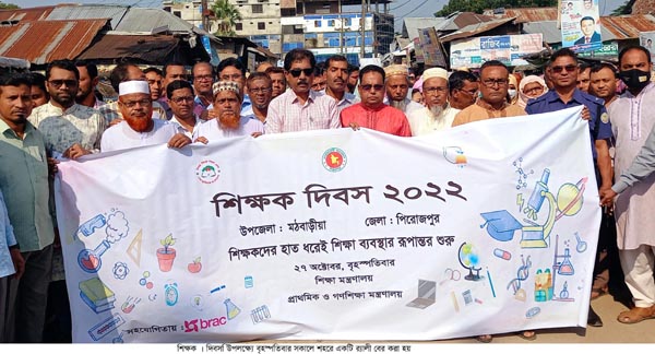 শিক্ষকদের হাত ধরেই শিক্ষা ব্যবস্থার রূপান্তর শুরু’’ এ প্রতিপাদ্যকে সামনে রেখে পিরোজপুরের মঠবাড়িয়ায় শিক্ষক দিবস পালিত হয়েছে। দিবসটি উপলক্ষ্যে বৃহস্পতিবার (২৭ অক্টোবর) সকালে পৌর শহরে একটি র্যালী বের করা হয়। র্যালীটি শহরের বিভিন্ন গুরুপ্তপূর্ণ সড়ক প্রদক্ষিণ শেষে কেন্দ্রীয় শহীদ মিনার চত্বরে আলোচনা সভায় মিলিত হয়।আলোচনা সভায় মঠবাড়িয়া সরকারী কলেজের অধ্যক্ষ গোলাম মোস্তফার সভাপতিত্বে বক্তব্য রাখেন উপজেলা নির্বাহী অফিসার ঊর্মি ভৌমিক, উপজেলা মাধ্যমিক শিক্ষা কর্মকর্তা মোঃ অলী আহাদ, মিরুখালী স্কুল এন্ড কলেজের অধ্যক্ষ আলমগীর হোসেন খান, টিকিকাটা নূরীয়া ফাজিল মাদ্রাসার অধ্যক্ষ মাওলানা আবু জাফর, বেতমোর আশ্রাফুল উলুম ফাজিল মাদ্রাসার উপাধ্যক্ষ মাওলানা শাহজালাল, উপজেলা শিক্ষক কর্মচারী কো-অপারেটিভ ইউনিয়ন লিঃ এর সভাপতি মোঃ নাসির উদ্দিন, সরকারি হাতেম আলী বালিকা মাধ্যমিক বিদ্যালয়ের প্রধান শিক্ষক মোঃ রুহুল আমিন, সাপলেজা মডেল মাধ্যমিক বিদ্যালয়ের প্রধান শিক্ষক আব্দুর রাশেদ, রাজারহাট শহীদ বাচ্চু মাধ্যমিক বিদ্যালয়ের প্রধান শিক্ষক মোঃ জহির খান, ডাঃ রুস্তম আলী ফরাজী কলেজের প্রভাষক মোঃ মোতালেব হোসেন, মাহবুবুর রহমান রামিম ও প্রাথমিক বিদ্যালয়ের প্রধান শিক্ষক সুমন্ত্র হালদার সুমন প্রমুখ।