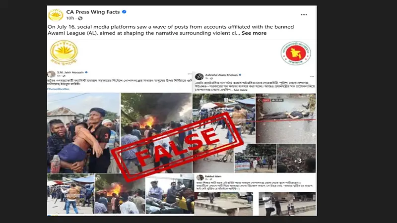 আওয়ামী লীগ বর্তমানে দেশে নৈরাজ্য সৃষ্টি করার জন্য তথ্যপ্রযুক্তি ব্যবহার করে না আমিতো ভুল তথ্য ছবি প্রচার করছে ফেসবুকের মাধ্যমে। তাদের এই কর্মকাণ্ড দীর্ঘদিন ধরে লক্ষ্য করা যাচ্ছে। ঠিক একই ভাবে গোপালগঞ্জের সংঘর্ষকে কেন্দ্র করে আওয়ামী লীগের একটি সংঘবদ্ধ চক্র সামাজিক যোগাযোগমাধ্যমে একাধিক পুরোনো ও ঘটনার সঙ্গে সম্পর্কহীন ছবি পোস্ট করে মিথ্যা তথ্য ছড়িয়েছে বলে এক বিবৃতিতে উল্লেখ করেছে প্রধান উপদেষ্টার প্রেস উইং। বুধবার (১৬ জুলাই) সিএ প্রেস উইং ফ্যাক্ট চেক তার ভেরিফায়েড ফেসবুক পেজে এক বিবৃতিতে জানায়, ‘১৬ জুলাই সামাজিক যোগাযোগমাধ্যমে কার্যক্রম নিষিদ্ধ আওয়ামী লীগের সংশ্লিষ্ট একাধিক অ্যাকাউন্ট থেকে গোপালগঞ্জের সংঘর্ষ নিয়ে নানা পোস্ট ছড়ানো হয়, এর উদ্দেশ্য ছিল এ দিনের সহিংস ঘটনার মনগড়া বক্তব্য প্রতিষ্ঠা করা। বিবৃতিতে আরও বলা হয়, ‘একটি সংগঠিত প্রোপাগান্ডা অভিযানের অংশ হিসেবে প্রভাবশালী আওয়ামীলীগপন্থিরা পুরোনো ও ঘটনার সঙ্গে সম্পর্কহীন একাধিক ছবি শেয়ার করেছেন, যা এদিনের সহিংসতার দৃশ্য বলে মিথ্যাভাবে উপস্থাপন করা হয়েছে। ’