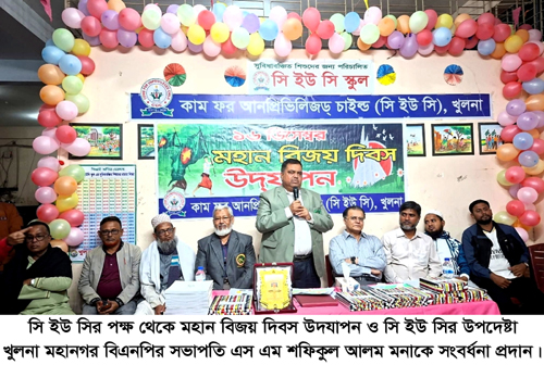 সমাজের সুবিধাবঞ্চিত শিশু ও দরিদ্র মানুষের কল্যাণে নিবেদিত সামাজিক সংগঠন কাম ফর আনপ্রিভিলিজড চাইল্ড সি ইউ সি খুলনার পক্ষ থেকে মহান বিজয় দিবস উদযাপন, পুরস্কার বিতরণী ও খুলনা মহানগর বিএনপির সভাপতি ও সিইউসির উপদেষ্টা এস এম শফিকুল আলম মনাকে সংবর্ধনা প্রদান করা হয় ।গত ১৬ ডিসেম্বর ২০২৫ ইং, মঙ্গলবার সি ইউ সি স্কুল ৬১ সাউথ সেন্ট্রাল রোড নার্গিস মেমোরিয়াল হসপিটাল খুলনায় সিইউসি স্কুলের অনুষ্ঠিত অনুষ্ঠানে প্রধান অতিথি এবং সংবর্ধিত অতিথি হিসেবে উপস্থিত ছিলেন খুলনা মহানগর বিএনপির সম্মানিত সভাপতি ও সিইউসির উপদেষ্টা এস এম শফিকুল আলম মনা। সিইউসির সভাপতি জনাব মোঃ শাহিন হোসেনের সভাপতিতে এবং আরিফা ইসলাম খুকুমনির সঞ্চালনায় অনুষ্ঠানে অতিথি হিসেবে উপস্থিত ছিলেন সিইউসির প্রধান উপদেষ্টা ডাক্তার কাজী আরিফ উদ্দিন আহমেদ, শ্রম আদালত খুলনার প্যানেল জাজ রোটারিয়ান পিপি জনাব মোঃ ইফতেখার আলী বাবু,সি ইউ সি এর উপদেষ্টা মাওলানা ডি এম নুরুল ইসলাম, সংগঠনের সহ-সভাপতি জনাব শহিদুল্লাহ শহীদ, যুগ্ম সম্পাদক আরিফা ইসলাম খুকুমণি, কোষাধ্যক্ষ মীমা আক্তার মনিকা, দপ্তর সম্পাদক কারীমা আক্তার, সিইউসি স্কুলের প্রধান শিক্ষক মোহাম্মদ মুজাহিদ হোসেন মিরাজ, ঝরনা বেগম, মুফতি সাজিদুর রহমান, আকলিমা বেগম, হালিমা বেগম, মোঃ মামুনুর রশিদ, মুক্তা আক্তার,মোঃ ফজলুল হক, বিএনসিসি ক্যাডেট সুখী, ক্যাডেট শাহিন, ক্যাডেট পবন,সিইউসি স্কুলের শিক্ষার্থী এবং অভিভাবকবৃন্দ। অনুষ্ঠান শেষে শিক্ষার্থীদের উন্নত শিক্ষা গ্রহণ এবং ভবিষ্যৎ গঠনের জন্য বিশেষ দোয়া অনুষ্ঠিত হয়। দোয়া মোনাজাত পরিচালনা করেন সিইউসি সংগঠনের উপদেষ্টা ও নেসারিয়া কামিল মাদ্রাসার উপাধ্যক্ষ আলহাজ্ব হযরত মাওলানা ডি এম নুরুল ইসলাম। অনুষ্ঠানে মহান বিজয় দিবস উপলক্ষে সুবিধাবঞ্চিত শিশুদের নিয়ে চিত্রাংকন প্রতিযোগিতার পুরস্কার বিতরণ ও সংগঠনের পক্ষ থেকে সংবর্ধিত অতিথিকে ক্রেস্ট প্রদান করা হয়। অনুষ্ঠান শেষে সাবেক প্রধানমন্ত্রী বেগম খালেদা জিয়া, ২০২৪ এর আন্দোলনের সম্মুখ যোদ্ধা শরীফ ওসমান হাদীর রোগ মুক্তি, শহীদ মুক্তিযোদ্ধাদের রুহের আত্মার মাগফেরাত কামনা এবং দেশ ও জাতির কল্যাণে বিশেষ দোয়া মোনাজাত অনুষ্ঠিত হয়।