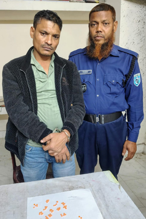 দিনাজপুরের পার্বতীপুর উপজেলায় পুলিশের অভিযানে ৬২ পিস ইয়াবাসহ এক মাদক ব্যবসায়ীকে গ্রেপ্তার করা হয়েছে। এ ঘটনায় পার্বতীপুর মডেল থানায় মাদকদ্রব্য নিয়ন্ত্রণ আইনে (মামলা নং ২৩, ২৬/০২/২০২৬ ইং) মামলা দায়ের করা হয়েছে। বুধবার (২৫ ফেব্রুয়ারি) রাত পোনে ১১টার দিকে উপজেলার হাবড়া ইউনিয়নের পিরোজপুর গ্রামের একটি নিচু জমিতে ইয়াবা ট্যাবলেট বিক্রির সময় ভবানীপুর পুলিশ তদন্ত কেন্দ্রের সদস্যরা অভিযান চালিয়ে তাকে হাতেনাতে আটক করেন।ধৃত আমজাদ হোসেন (৪৫) হাবড়া ইউনিয়নের পিরোজপুর তাতীপাড়া গ্রামের আমিনুল ইসলামের ছেলে। এ বিষয়ে ভবানীপুর পুলিশ তদন্ত কেন্দ্রের ইনচার্জ (আইসি) মো. নজরুল ইসলাম জানান, গোপন সংবাদের ভিত্তিতে জানতে পারেন যে পিরোজপুর গ্রামের একটি নিচু জমিতে ইয়াবা বিক্রি হচ্ছে। পরে সেখানে অভিযান চালিয়ে আমজাদ হোসেনকে ৬২ পিস ইয়াবাসহ আটক করা হয়। তার বিরুদ্ধে মাদকদ্রব্য নিয়ন্ত্রণ আইনে মামলা দায়ের করা হয়েছে।বৃহস্পতিবার সকালে তাকে দিনাজপুর জেলহাজতে পাঠানো হয়েছে। এর আগে জুয়া আইনে তার বিরুদ্ধে একটি মামলা ছিল বলে পুলিশ জানিয়েছে।