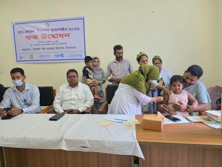 পিরোজপুর জেলার জিয়ানগরে হাম ও রুবেলা রোগ প্রতিরোধে বিশেষ টিকাদান ক্যাম্পেইন ২০২৬-এর উদ্বোধন সোমবার (২০ এপ্রিল) জিয়ানগর উপজেলা স্বাস্থ্য কমপ্লেক্সে নতুন ভবনে অনুষ্ঠিত হয়েছে। উদ্বোধনের মধ্য দিয়ে উপজেলার বিভিন্ন এলাকায় একযোগে টিকাদান কার্যক্রম শুরু হয়েছে। উপজেলা স্বাস্থ্য বিভাগের আয়োজনে উপজেলা স্বাস্থ্য কমপ্লেক্স প্রাঙ্গণে অনুষ্ঠিত এ কর্মসূচির উদ্বোধন করেন উপজেলা নির্বাহী অফিসার হাসান মো.হাফিজুর রহমান অনুষ্ঠানে সভাপতিত্ব করেন উপজেলা স্বাস্থ্য ও পরিবার পরিকল্পনা কর্মকর্তা ডাক্তার ননী গোপাল রায়। উপজেলা স্বাস্থ্য বিভাগ সূত্রে জানা যায়, এ ক্যাম্পেইনের আওতায় মোট ৭ হাজার ৭৪০ জন শিশুকে টিকার আওতায় আনার লক্ষ্যমাত্রা নির্ধারণ করা হয়েছে। এ লক্ষ্যে মোট ৫ হাজার ভ্যাকসিন সরবরাহ করা আছে । পুরো উপজেলায় ১১ টি অস্থায়ী কেন্দ্রের মাধ্যমে এ টিকাদান কার্যক্রম পরিচালিত করা হবে।প্রথম দিনে উপজেলার ৫ টি ইউনিয়নে কার্যক্রম শুরু হয়েছে এবং আজকের লক্ষ্যমাত্রা নির্ধারণ করা হয়েছে ৫৫১জন শিশুকে টিকা প্রদান। টিকাদান ক্যাম্পেইন অনুষ্ঠানে উপজেলা নির্বাহী অফিসার হাসান মো.হাফিজুর রহমান ,বক্তব্যে বলেন হাম ও রুবেলা শিশুদের জন্য মারাত্মক ঝুঁকিপূর্ণ রোগ। সময়মতো টিকাদানের মাধ্যমে এসব রোগ প্রতিরোধ সম্ভব। তাই সকল অভিভাবককে নির্ধারিত সময় অনুযায়ী তাদের শিশুদের টিকা দেওয়ার আহ্বান জানানো হয়।উপজেলা স্বাস্থ্য বিভাগ জানায়, ধাপে ধাপে পুরো উপজেলায় এ কার্যক্রম পরিচালিত হবে এবং শতভাগ শিশুকে টিকার আওতায় আনার লক্ষ্যেই এ উদ্যোগ বাস্তবায়ন করা হচ্ছে। ক্যাম্পেইনে এ সময় উপস্থিত ছিলেন আবাসিক মেডিকেল অফিসার ডাঃ আকাস সাহা, আবাসিক মেডিকেল অফিসার ডাক্তার লিমন দাস, মেডিকেল অফিসার ডাক্তার জান্নাতুল ফেরদৌস, হাম ও রুবেলা ঠিকাদার কর্মসূচির টেকনিশিয়ান রিয়াদ, সহ উপজেলা স্বাস্থ্য বিভাগের অন্যান্য চিকিৎসক, নার্স ও কর্মকর্তারা উপস্থিত ছিলেন।